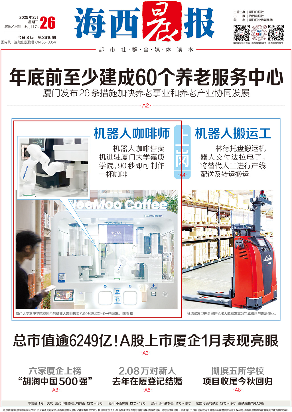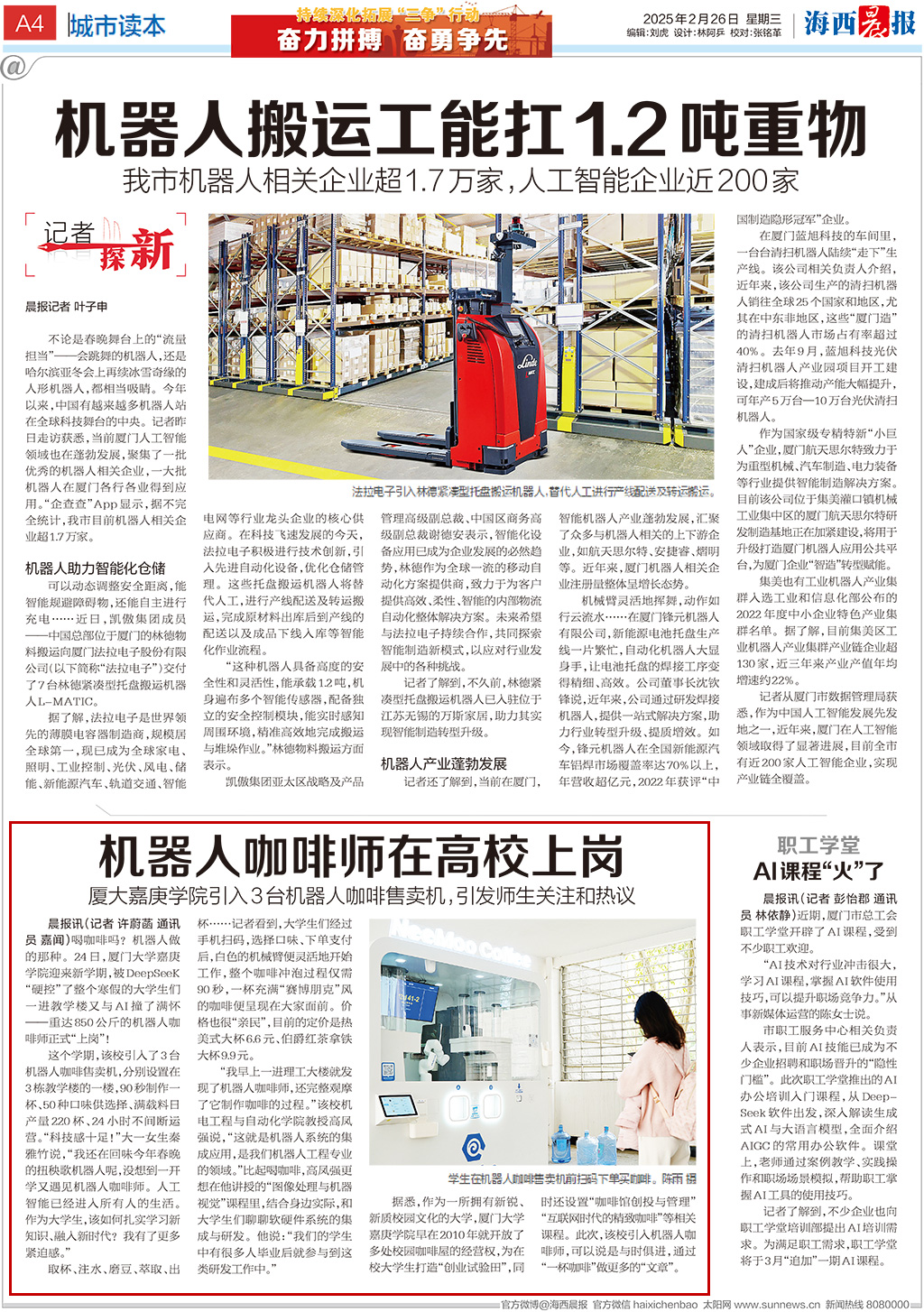 晨報(bào)訊(記者 許蔚菡 通訊員 嘉聞)喝咖啡嗎?機(jī)器人做的那種。24日,廈門大學(xué)嘉庚學(xué)院迎來新學(xué)期,被DeepSeeK“硬控”了整個(gè)寒假的大學(xué)生們一進(jìn)教學(xué)樓又與AI撞了滿懷——重達(dá)850公斤的機(jī)器人咖啡師正式“上崗”!