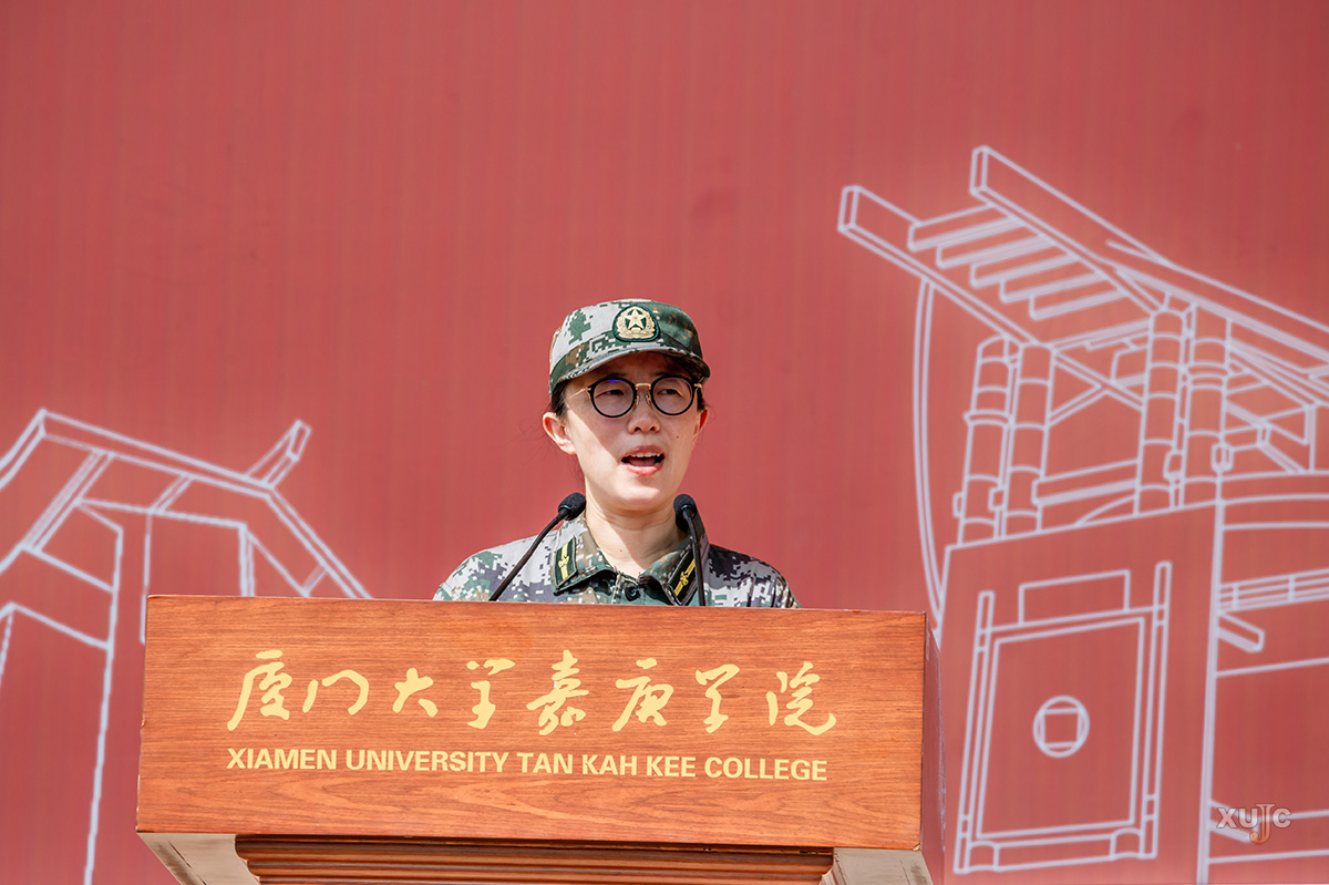 學(xué)生軍訓(xùn)工作領(lǐng)導(dǎo)小組副組長、軍訓(xùn)團(tuán)政委姚祖嬋宣布2025級新生軍訓(xùn)團(tuán)機(jī)構(gòu)編成。