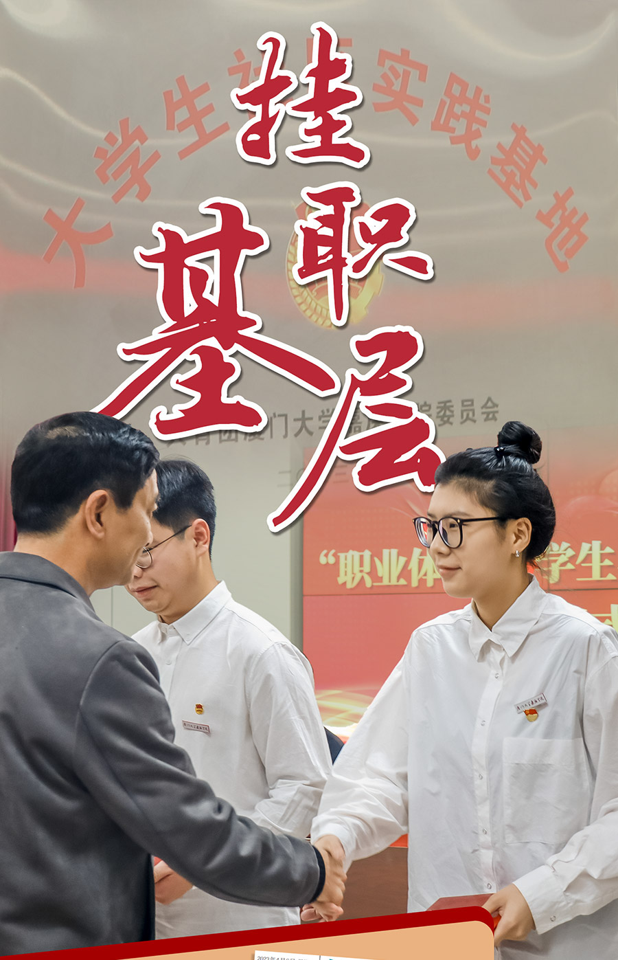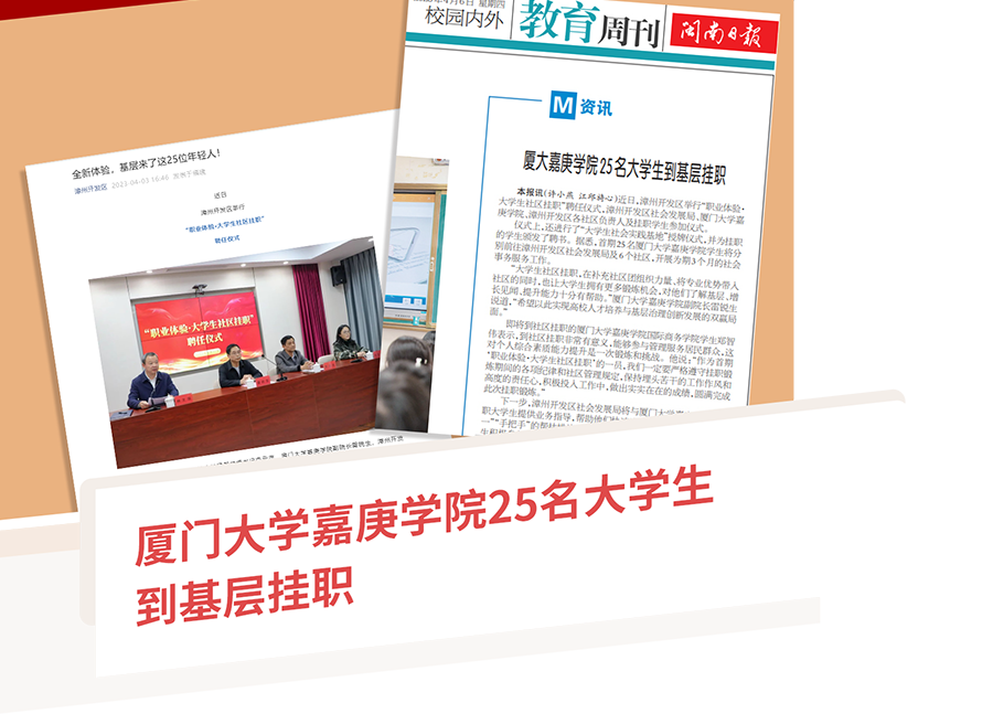 2023年3月30日,我校聯(lián)合漳州開(kāi)發(fā)區(qū)舉辦大學(xué)生社區(qū)實(shí)踐基地授牌暨“職業(yè)體驗(yàn)·大學(xué)生社區(qū)掛職”聘任儀式。首期25名我校學(xué)子獲聘,分別前往漳州開(kāi)發(fā)區(qū)社會(huì)發(fā)展局及6個(gè)社區(qū),開(kāi)展為期3個(gè)月的社會(huì)事務(wù)服務(wù)工作。閩南日?qǐng)?bào)、漳州開(kāi)發(fā)區(qū)官方公眾號(hào)等媒體(平臺(tái))在報(bào)道中稱之為“全新體驗(yàn)”“大學(xué)生為地方發(fā)展注入青春力量”。
