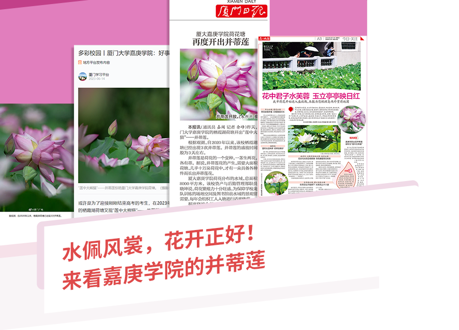 不負(fù)眾望,盛夏里,我校棲霞湖荷塘又開(kāi)出“蓮中大熊貓”——并蒂蓮。自2020年以來(lái),這已是第3次。學(xué)習(xí)強(qiáng)國(guó)平臺(tái)、廈門日?qǐng)?bào)、廈門廣電、廈門晚報(bào)、漳州開(kāi)發(fā)區(qū)官方視頻號(hào)等一眾主流媒體“輕車熟路”給予報(bào)道,圖、文、視頻,各媒體以多種手法將來(lái)自“嘉園”的十萬(wàn)分之一幸運(yùn)分享給社會(huì)大眾。