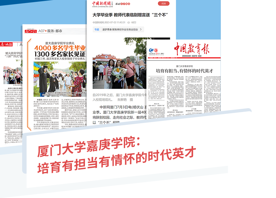 炎夏,畢業(yè)季,又到鳳凰花開(kāi)的路口。包括中國(guó)新聞網(wǎng)在內(nèi)的全國(guó)多家主流媒體從多個(gè)角度聚焦、報(bào)道我校的畢業(yè)生風(fēng)采、畢業(yè)典禮。其中,中國(guó)教育報(bào)于2023年6月21日在第八版刊發(fā)深度報(bào)道,探究我校創(chuàng)辦20年來(lái)的人才培養(yǎng)特色、成就,描摹我校人才特質(zhì)、形象。文章分為“敢為人先”“勇于擔(dān)當(dāng)”“止于至善”三個(gè)層次,介紹我校作為一所不一樣的大學(xué),所培養(yǎng)的不一樣人才。文章指出,“20年來(lái),嘉庚學(xué)院不負(fù)所望,已經(jīng)成為一所深得廣大師生熱愛(ài)、深受國(guó)內(nèi)外各界認(rèn)可的新型優(yōu)質(zhì)大學(xué)。”