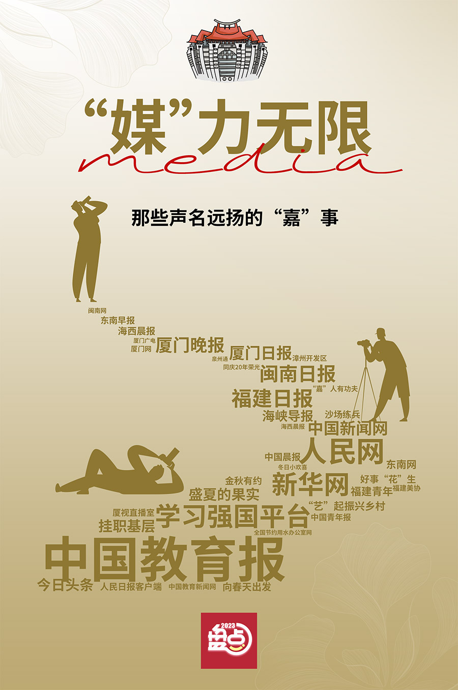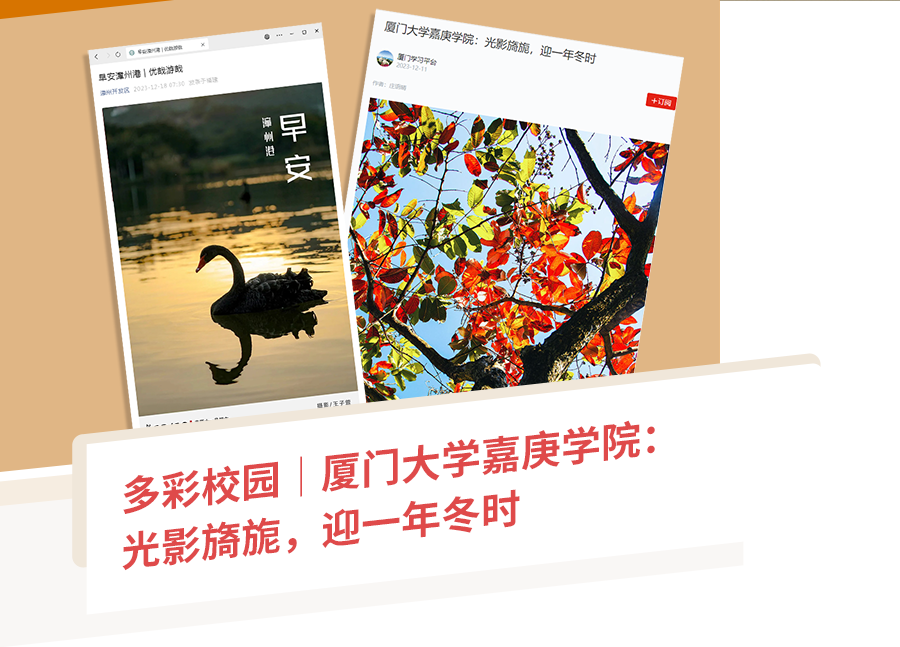 2023年,包括中國(guó)教育報(bào)、學(xué)習(xí)強(qiáng)國(guó)平臺(tái)、新華網(wǎng)、人民網(wǎng)、中國(guó)新聞網(wǎng)、福建日?qǐng)?bào)、海峽導(dǎo)報(bào)、閩南日?qǐng)?bào)、廈門日?qǐng)?bào)、廈門晚報(bào)、海西晨報(bào)、東南早報(bào)、廈門廣電、閩南網(wǎng)、廈門網(wǎng)在內(nèi)的40多家全國(guó)主流媒體向“嘉園”投注了目光,用361篇(次)報(bào)道講述“嘉園”故事,將魅力“嘉園”帶到時(shí)空的最遠(yuǎn)方、人群的最深處。