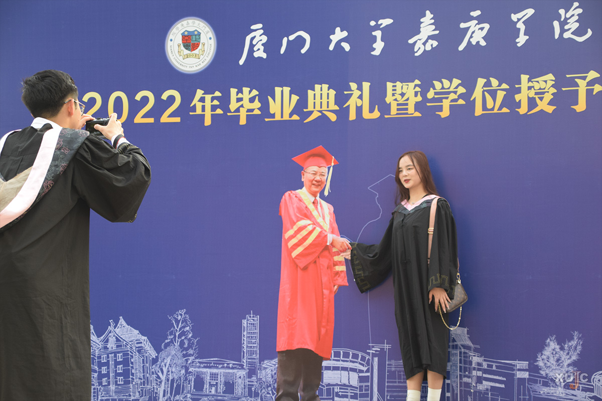 廈門大學(xué)嘉庚學(xué)院校長(zhǎng)王瑞芳因公務(wù)出國(guó)在外,校方在現(xiàn)場(chǎng)設(shè)置真人比例的拍照模板,滿足畢業(yè)生的合影愿望。彭雅竹攝