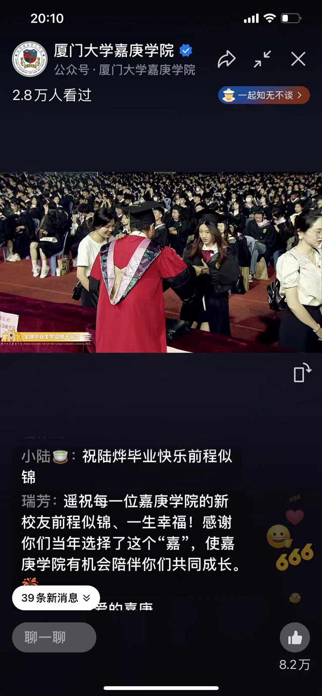 值得一提的是,因公務(wù)出國(guó)在外的該校校長(zhǎng)王瑞芳首度未能親臨畢業(yè)典禮現(xiàn)場(chǎng)。不過,很快,師生們就在直播間里驚喜“捕獲”在線的王瑞芳,他深情留言:“遙祝每一位嘉庚學(xué)院的新校友前程似錦、一生幸福!感謝你們當(dāng)年選擇了這個(gè)‘嘉’,使嘉庚學(xué)院有機(jī)會(huì)陪伴你們共同成長(zhǎng)。”