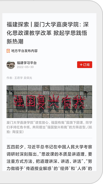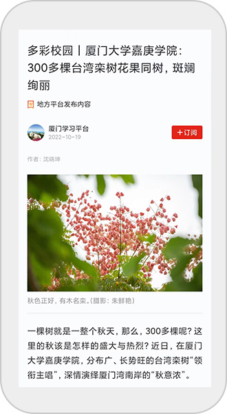 和“盡收眼底,大飽眼福”的人民日報不同,學(xué)習(xí)強國平臺喜歡打開敏銳觸角,跟隨時令、季節(jié),一點一點感受“嘉園”生動、輕靈的美。它說,我校的風(fēng)鈴木下,滿地“黃金”;還說,“嘉園”里流光溢彩的臺灣欒樹深情演繹了廈門灣南岸的“秋意濃”……
