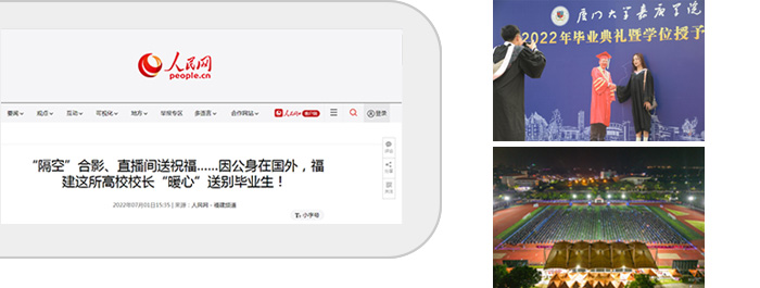 2022年5月,因?qū)嵙?xí),疫居省外的2022屆畢業(yè)生彭維興原以為要錯過畢業(yè)合影了。但合影那天,根據(jù)他的身高制作的學(xué)士服造型人形立牌出現(xiàn)在了“嘉園”。同學(xué)們紛紛和“彭維興”合影,以主樓群為背景的集體大合影也是“一個都不少”。 盛夏,2022年畢業(yè)典禮溫馨上演。王瑞芳院長因公務(wù)出國在外,未能親臨現(xiàn)場。不過,他通過直播,在線深情留言:“遙祝每一位嘉庚學(xué)院的新校友前程似錦、一生幸福!感謝你們當(dāng)年選擇了這個‘嘉’,使嘉庚學(xué)院有機會陪伴你們共同成長。”典禮現(xiàn)場還有王瑞芳真人比例的拍照模板,滿足畢業(yè)生們與院長握手拍照的心愿……