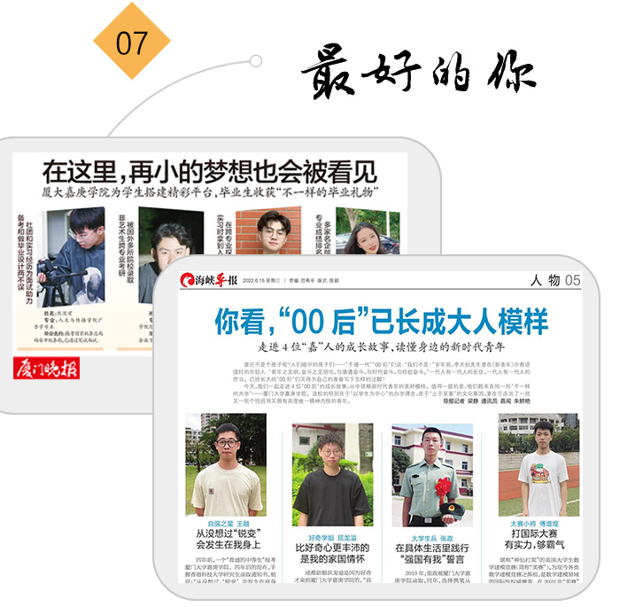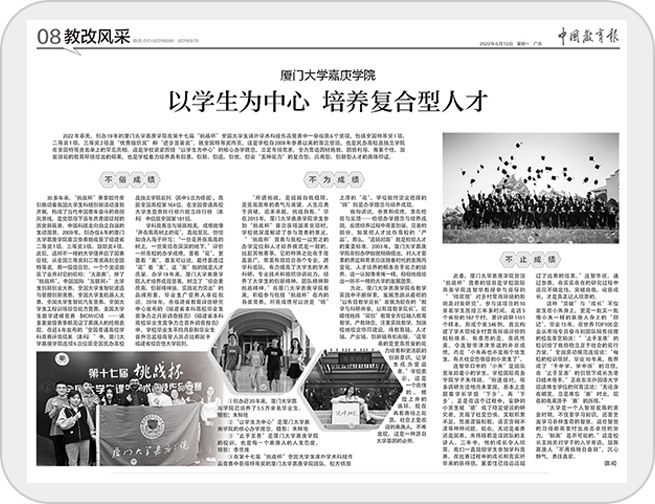 2022年,咱“嘉”有306篇新聞獲社會媒體報道、轉(zhuǎn)發(fā)。包括新華社、人民日報、學(xué)習(xí)強國平臺、央視網(wǎng)、中國教育報、中國新聞網(wǎng)、三聯(lián)生活周刊、福建日報、閩南日報、廈門日報、海峽導(dǎo)報、東南早報、廈門晚報、海西晨報、東南網(wǎng)、廈門網(wǎng)在內(nèi)的40多家全國、省市主流媒體對咱“嘉”進行了精彩報道。