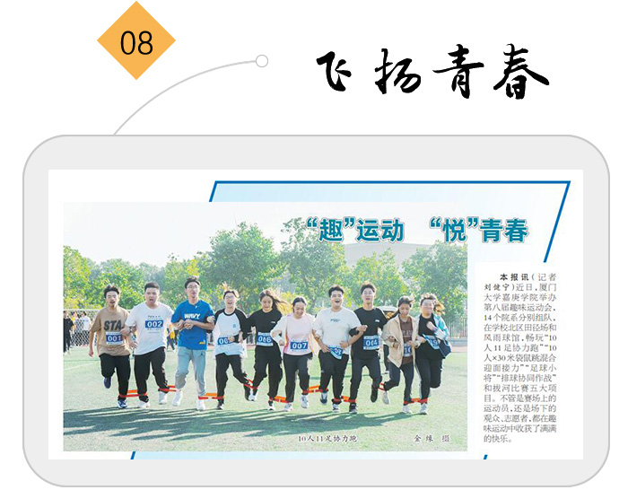 媒體記者們以圖文,用視頻,多元素多角度展現(xiàn)一個“燃”字。 中國新聞網(wǎng)報道稱:“廈門大學(xué)嘉庚學(xué)院1100多名大學(xué)新生組成旗語活字表演方陣,以青年人的清澈熱愛告白偉大祖國。”閩南日報用6個字點評我校第八屆趣味運動會:“趣”運動,“悅”青春。廈門網(wǎng)認(rèn)為,五四青年節(jié)當(dāng)天,我校舉辦多彩環(huán)校跑活動,進一步營造了寓教于樂的濃厚氛圍。 青春飛揚,如此優(yōu)雅!