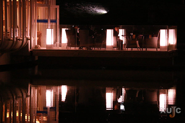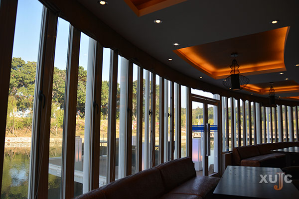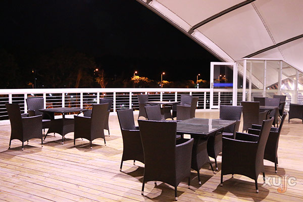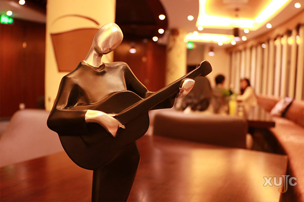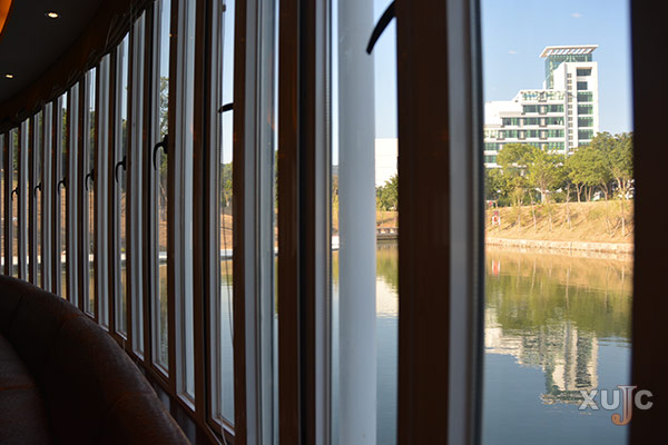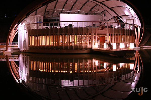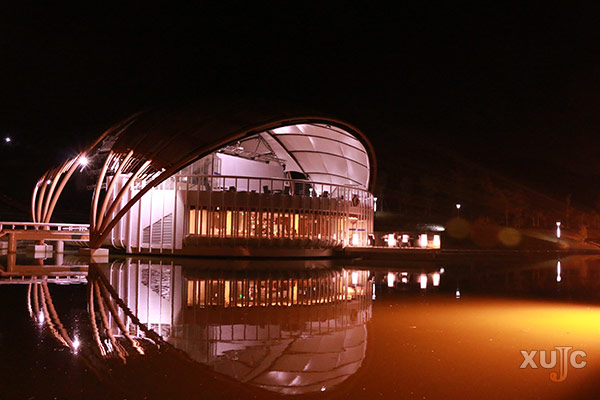 這間咖啡廳位于落成不久的水上音樂廣場舞臺后方,空間呈半圓形,分上下兩層。下層主空間的裝修雍容大氣、家具典雅舒適,上層視野開闊、風(fēng)景秀美。