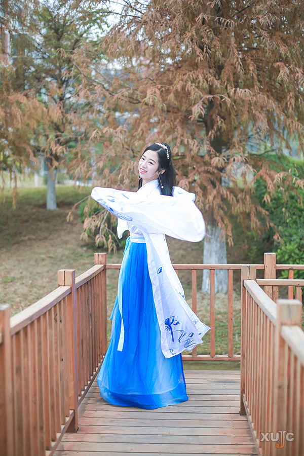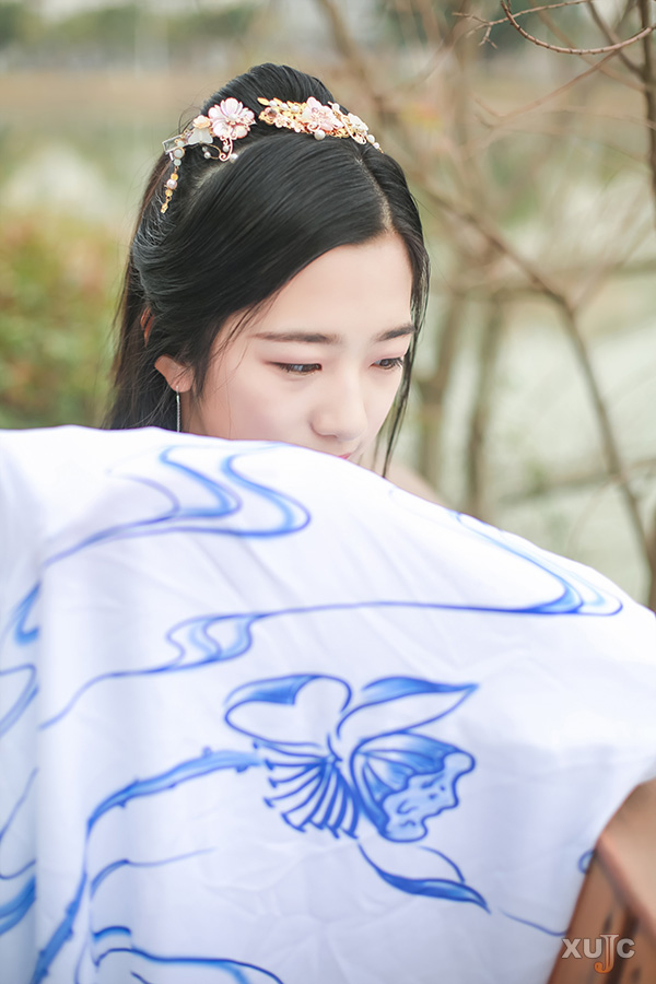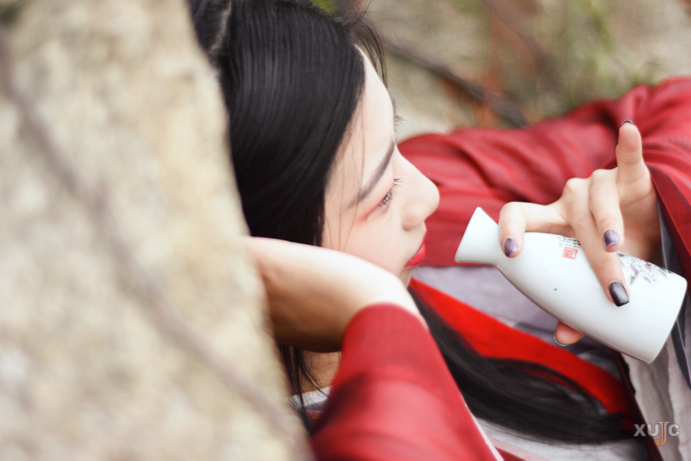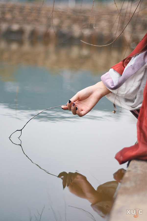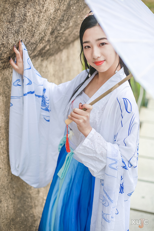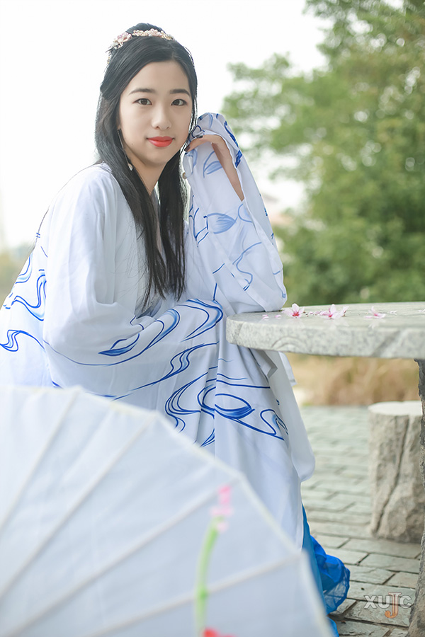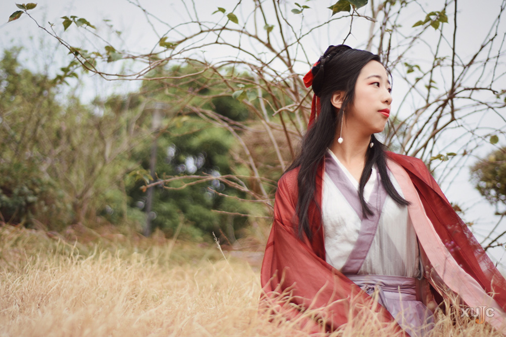 交領(lǐng)右衽,雖衫袂春風(fēng),腰間帶紅