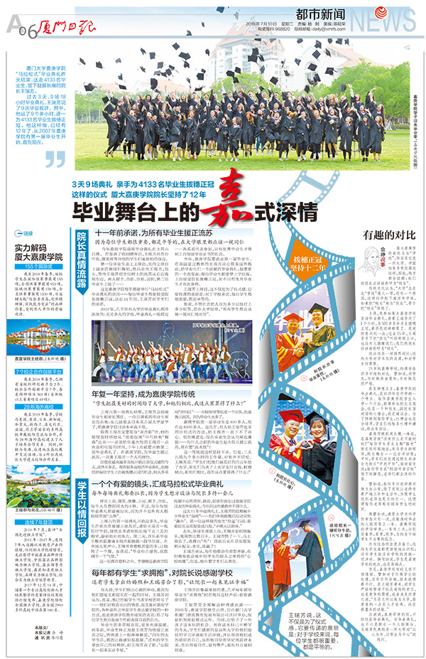 上周六第一場典禮結(jié)束,王瑞芳立刻被畢業(yè)生和家長圍住。一位日語系的畢業(yè)生家長告訴他:女兒就要去日本名古屋大學(xué)留學(xué)了,咱嘉庚學(xué)院日語水平真不低。