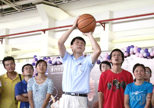 學工組隊伍(一)的三名女將出馬可謂是震撼全場,該組最終以投進7個球的成績位居前列,其中,趙慧老師連進兩球,現(xiàn)場觀眾無不為之吶喊,為之加油。“我覺得定點投籃和身高沒有多大的關(guān)系吧,主要看你的技巧、機遇和現(xiàn)場的支持。”賽后,趙慧老師告訴記者。