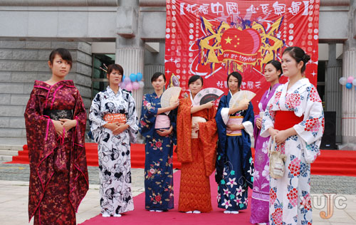 迎面走來的是一群“日本少女”,她們身著日式傳統(tǒng)服裝,姿態(tài)優(yōu)雅大方。先別驚訝,這里不是異國他鄉(xiāng),而是在我院校園開放日學生社團DIY的活動現(xiàn)場。