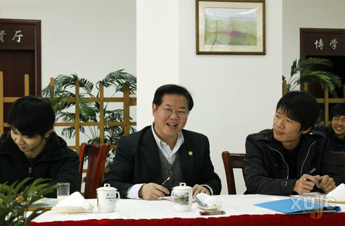 1月15日,雖然是個(gè)周末,但日語系的謝建偉同學(xué)卻早早起床,細(xì)心地在胸前別上?;?,來到漳州校區(qū)賓館,與其他19名同學(xué)一起和廈門大學(xué)校長、我院董事長朱崇實(shí)共進(jìn)早餐,并進(jìn)行了長達(dá)3個(gè)小時(shí)的交談。在早餐會(huì)上,謝建偉還“斗膽”向朱校長要了兩個(gè)簽名作為生日祝福送給同學(xué)。