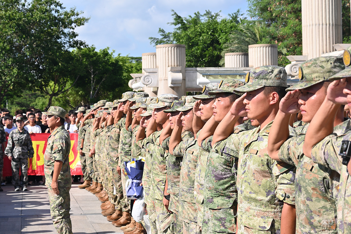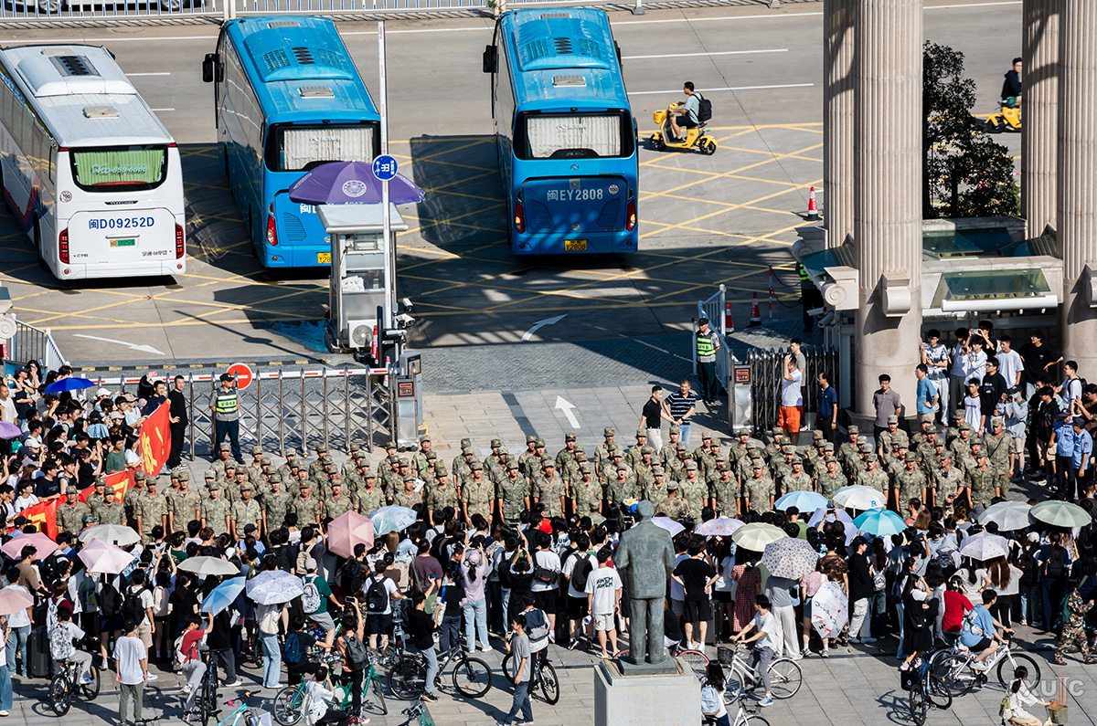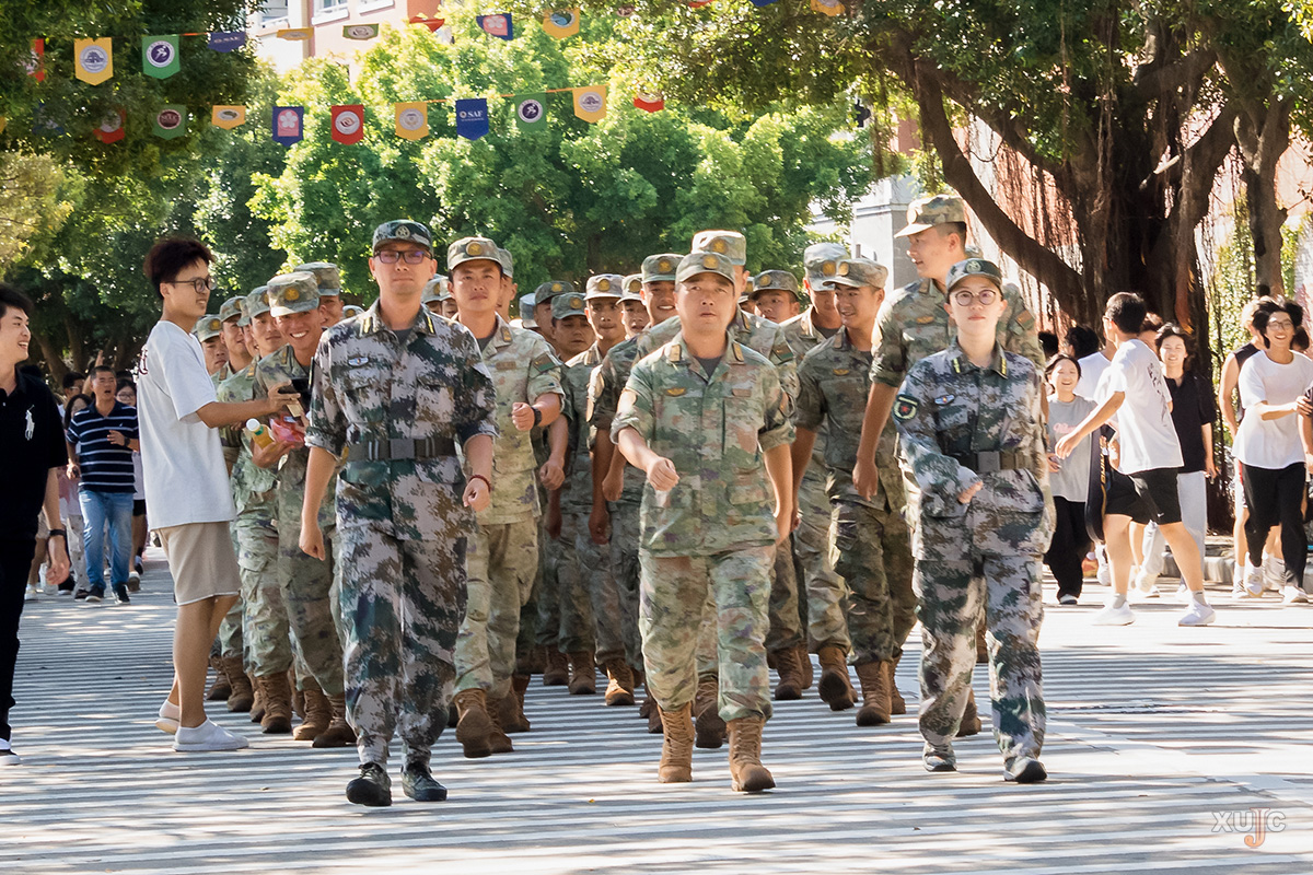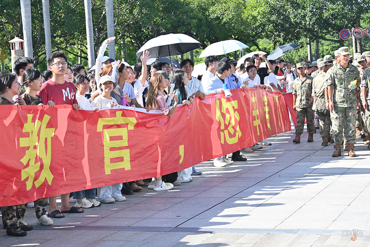 三點整,身著整齊軍裝的教官們邁著鏗鏘有力的步伐,列隊而來,沿著嘉庚大道,準備踏上歸程。
