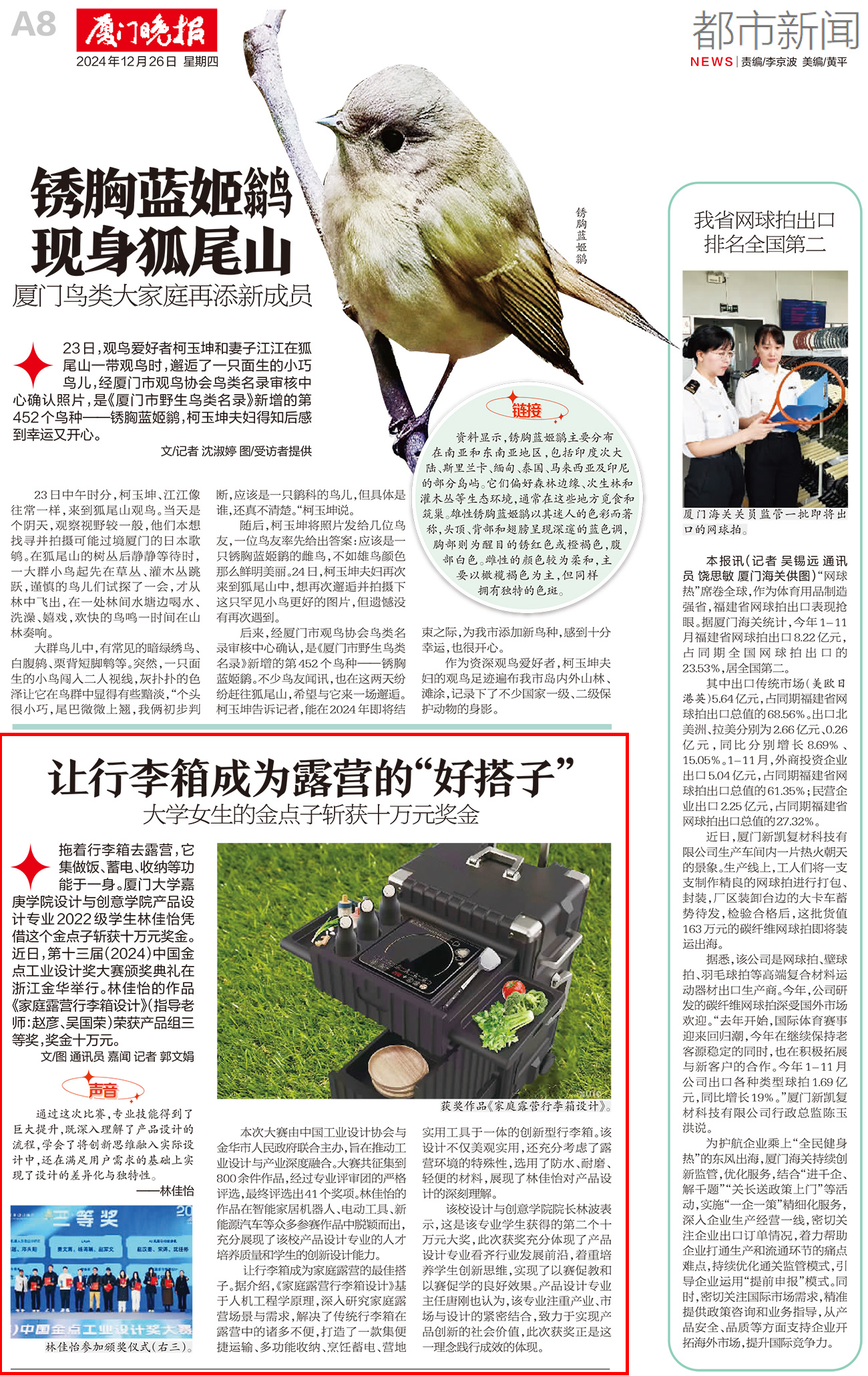 拖著行李箱去露營,它集做飯、蓄電、收納等功能于一身。廈門大學嘉庚學院設計與創(chuàng)意學院產品設計專業(yè)2022級學生林佳怡憑借這個金點子斬獲十萬元獎金。近日,第十三屆(2024)中國金點工業(yè)設計獎大賽頒獎典禮在浙江金華舉行。林佳怡的作品《家庭露營行李箱設計》(指導老師:趙彥、吳國榮)榮獲產品組三等獎,獎金十萬元。