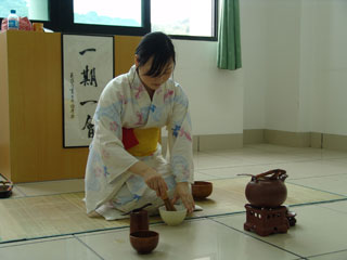 身著和服的柴山惠老師首先向來賓奉上了“茶前小甜點”,這是因為在日本茶道中所做的“抹茶”通常都比較苦,而小甜點則可以降低茶的苦度。在一小段茶道儀式之后,柴山老師正式開始作茶。只見老師不緊不慢且有條有理地使用各種茶道道具為來賓獻上了一場“藝術(shù)表演”。日本茶道講究一種“和寂清凈”的心靈境界,因此整個表演十分安靜、優(yōu)雅。在表演至客人喝茶的階段的時候,柴山老師又向大家傳授日本茶道中十分講究的喝茶方法。作茶工序結(jié)束后,柴山老師還向大家介紹了日本茶道的道具,老師聲情并茂的介紹博得了陣陣掌聲。每場表演持續(xù)將近十五分鐘。
