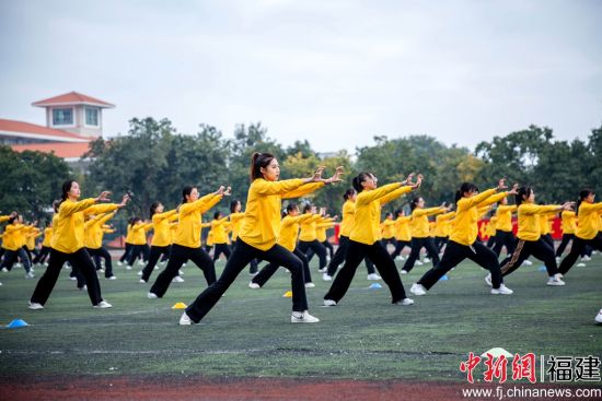 廈大嘉庚學(xué)院學(xué)生練起健身氣功易筋經(jīng),拉開(kāi)該校第八屆田徑運(yùn)動(dòng)會(huì)序幕。朱鮮艷 攝