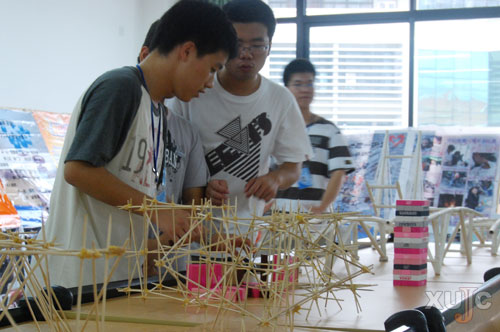 在土木工程系展廳里,記者看到該系學(xué)生在結(jié)構(gòu)設(shè)計大賽的作品——省結(jié)構(gòu)設(shè)計大賽的橋梁、用竹簽和皮筋做成的模型……在展廳內(nèi),來賓們還可以對這些模型進行加載試驗。土木工程系行政秘書兼輔導(dǎo)員吳佳奇老師接受記者采訪時說:“我們系是具有實用特色的專業(yè),適用性強,這樣的布置可以讓家長和學(xué)生更直觀地知道土木工程系的教學(xué)特色。”
