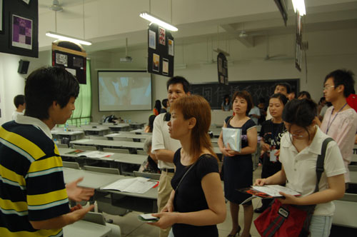 在志愿者的引導(dǎo)下,9點(diǎn)10分,新聞傳播系展廳迎來了第一位來賓。隨后展廳的來賓漸漸多了起來。志愿者們細(xì)心耐心地向他們介紹著由新聞系學(xué)生制作的宣傳冊(cè)、宣傳片、攝影作品、廣告作品等。許多學(xué)生家長(zhǎng)在觀看了學(xué)生作品之后,顯然對(duì)新聞傳播系的教學(xué)成果有了一定的認(rèn)可,紛紛找到新聞傳播系的專職教師,仔細(xì)詢問起專業(yè)課程的安排以及就業(yè)前景等問題。