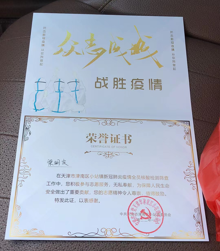 “經(jīng)過這次志愿者活動(dòng),我成長(zhǎng)了不少,更感受到了祖國(guó)的強(qiáng)大以及全國(guó)人民團(tuán)結(jié)一心抗擊疫情的中國(guó)式溫暖。”梁明慶說,這次經(jīng)歷帶給他很多感悟和感動(dòng)。值得一提的是,他還收獲了來自中共天津市津南區(qū)小站鎮(zhèn)委員會(huì)的榮譽(yù)證書,并點(diǎn)贊他:“您的志愿精神令人尊崇,值得鼓勵(lì)。”