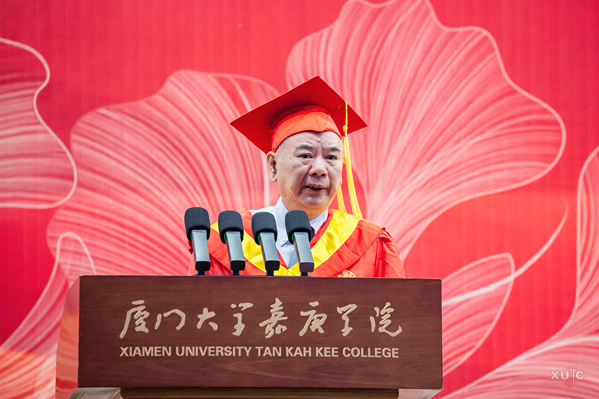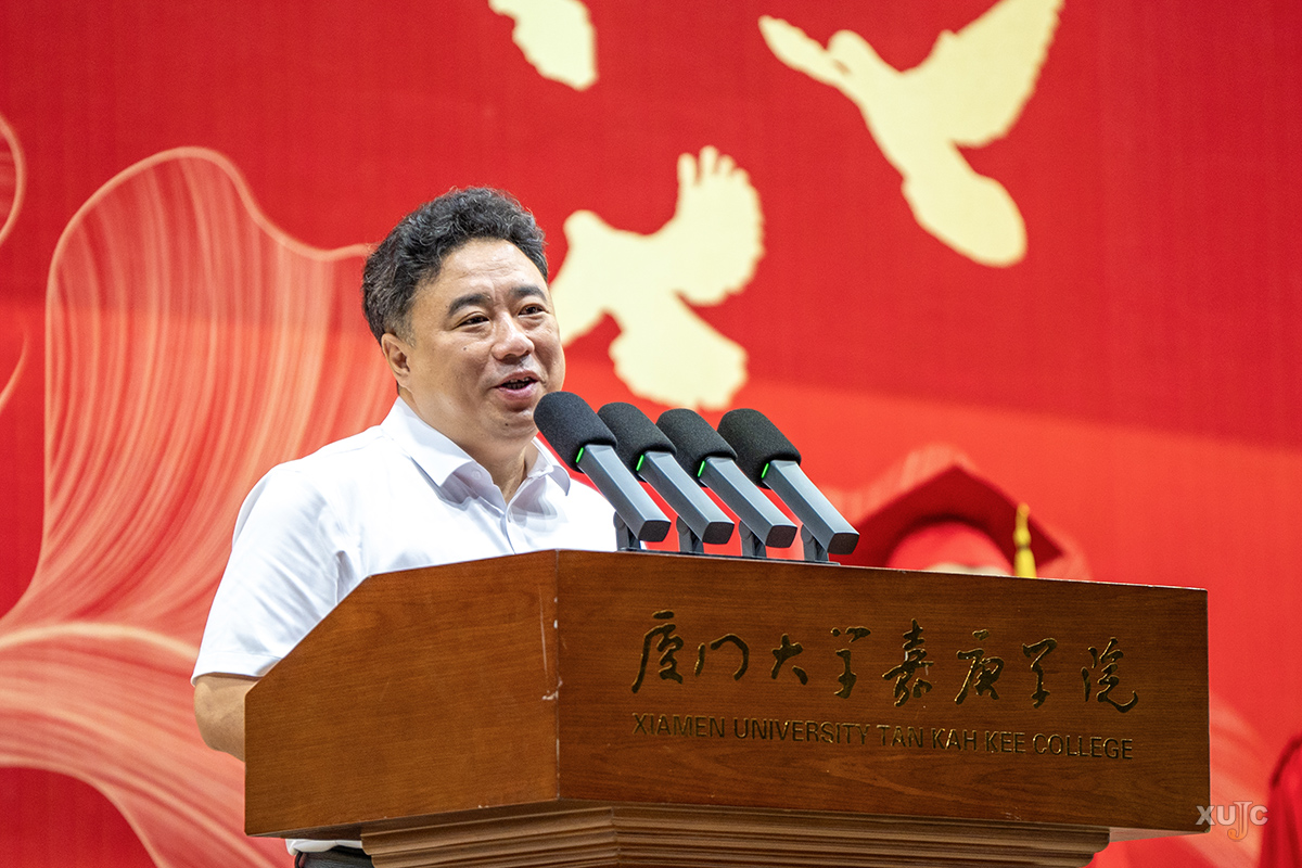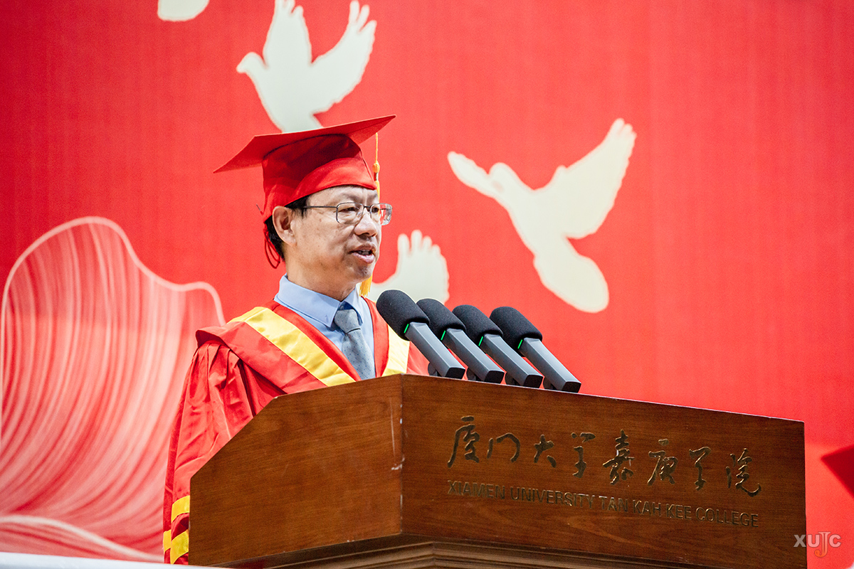 這屆畢業(yè)生大多數(shù)與嘉庚學(xué)院同齡。王瑞芳將當(dāng)年18歲的嘉庚學(xué)院與18歲學(xué)子的那場(chǎng)相遇,稱為“彼此最珍貴的成人禮”。他深情回顧了學(xué)子們?cè)?ldquo;嘉園”的求學(xué)時(shí)光,對(duì)他們?cè)谖幕瘋鞒?、鄉(xiāng)村振興、科創(chuàng)競(jìng)賽等方面的突出表現(xiàn)給予了高度肯定。