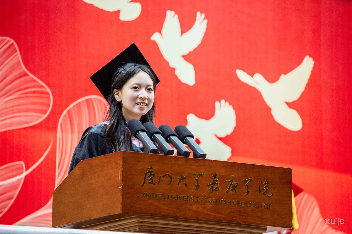 “感恩‘嘉園’照亮我前行之路,助我從笨拙起步,到一路向陽(yáng)。”畢業(yè)生代表、國(guó)際商務(wù)學(xué)院學(xué)子李艾琪深情回顧了在“嘉園”的點(diǎn)滴。一路走來(lái),她蟬聯(lián)專業(yè)第一,獲得“中國(guó)銀行獎(jiǎng)學(xué)金”“國(guó)家獎(jiǎng)學(xué)金”,成為“嘉庚之星”。李艾琪將這份佳績(jī)歸功于學(xué)校提供的廣闊平臺(tái)、師長(zhǎng)的悉心教導(dǎo)、同學(xué)的互助和嘉庚精神的指引。手握多所世界名校offer的她呼吁同學(xué)們:“讓我們帶著‘止于至善’的信念,以青春之名赴時(shí)代之約,在強(qiáng)國(guó)復(fù)興偉業(yè)中展現(xiàn)嘉庚學(xué)子的挺膺擔(dān)當(dāng)。”