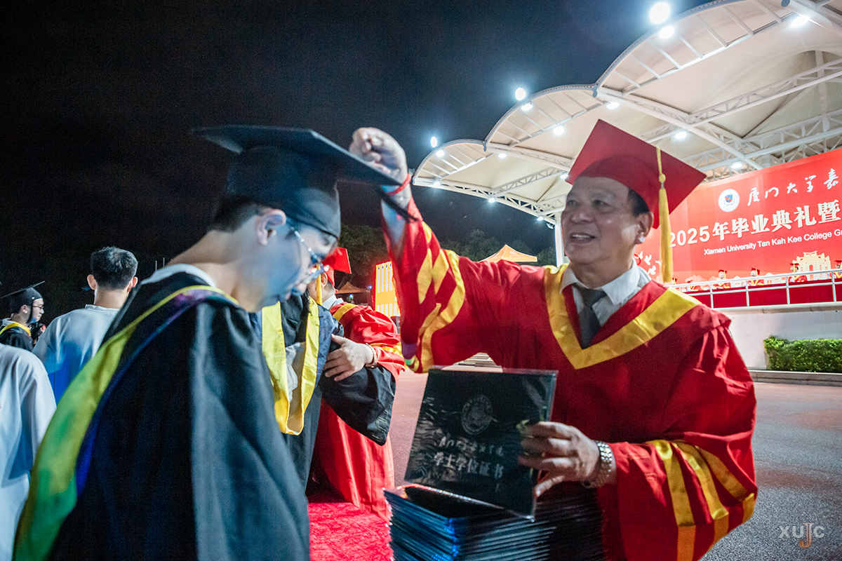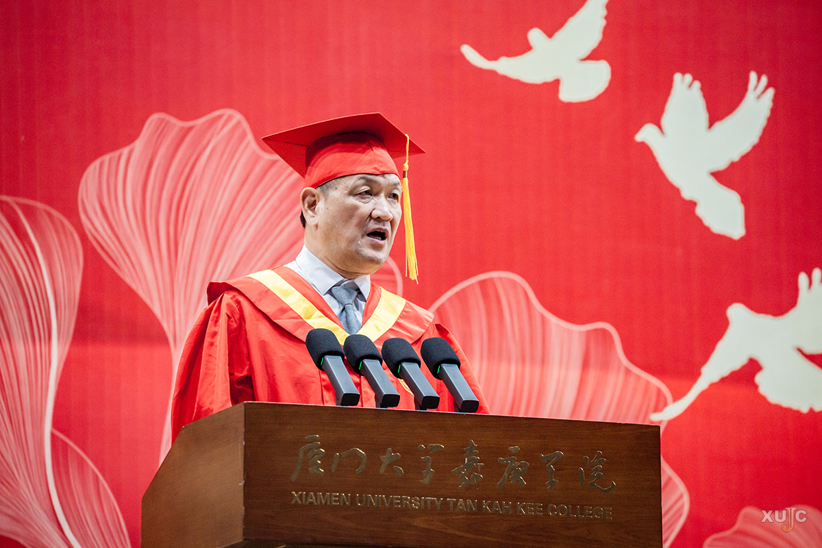 圍繞“破界創(chuàng)新、傳薪續(xù)火,駛向至善之境”這一主題,王瑞芳與畢業(yè)生們深入分享了三方面思考:社會(huì)需要什么樣的青年、如何順利實(shí)現(xiàn)從學(xué)生到社會(huì)人的轉(zhuǎn)變、嘉庚精神對(duì)當(dāng)代青年有什么啟示。他一如既往地送上學(xué)校“敬業(yè)、合作、務(wù)實(shí)、創(chuàng)新”的八字理念,殷切希望畢業(yè)生們能勇敢面對(duì)挑戰(zhàn)、積極開(kāi)拓進(jìn)取,在新的人生征程中書(shū)寫(xiě)屬于自己這代人的傳奇。最后,他深情寄語(yǔ)畢業(yè)生:“嘉庚學(xué)院永遠(yuǎn)是你們溫暖的港灣。愿你們帶著這一份力量與底氣,在浩瀚的人生海域中,駛向?qū)儆谧约旱闹辽浦场?rdquo;