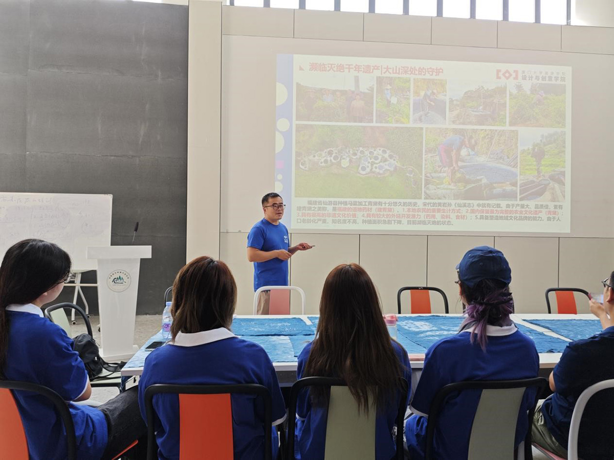 實踐尾聲,師生一行受邀前往仙游縣鄉(xiāng)村振興研究院進行成果展示。唐剛老師代表團隊系統(tǒng)呈現(xiàn)了實踐成果,從青黛技藝調研數(shù)據(jù)到創(chuàng)新設計方案,從非遺傳承現(xiàn)狀分析到活化路徑構想,條理清晰地展現(xiàn)了團隊深耕書峰鄉(xiāng)的實踐脈絡,為后續(xù)校地協(xié)同推進青黛非遺傳承與鄉(xiāng)村振興搭建起堅實的溝通橋梁。