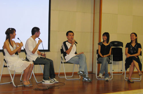 在一首歡快的英文歌和配樂朗誦后,晚會的高潮上演。05級的電影配音、畢業(yè)生訪談兩個環(huán)節(jié)中有歡笑有傷感,既有畢業(yè)生們對前路的憧憬,又有對學弟學妹們的勉勵和對校園的不舍。一時間,許多人熱淚盈睫。