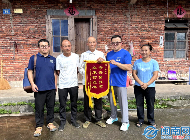 廈門(mén)大學(xué)嘉庚學(xué)院“沉‘靛’千年、青黛見(jiàn)福”喚醒計(jì)劃團(tuán)隊(duì)指導(dǎo)老師唐剛(右二)帶領(lǐng)團(tuán)隊(duì)走訪老匠人,并代表團(tuán)隊(duì)為黃鳳舟老人(中)頒發(fā)錦旗。(攝影:陳睿娛)