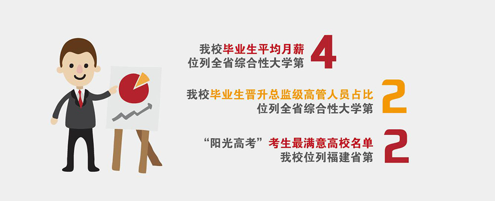 2018年11月,在福建省教育評(píng)估研究中心發(fā)布的《福建省本科高校畢業(yè)生競爭力之月薪調(diào)查報(bào)告》《福建省本科高校畢業(yè)生競爭力之晉升調(diào)查報(bào)告》中,我校畢業(yè)生平均月薪位列全省綜合性大學(xué)第四,畢業(yè)生晉升總監(jiān)級(jí)高管人員占比高居全省綜合性大學(xué)第二;在全省本科獨(dú)立院校與民辦高校中,我校這兩項(xiàng)指標(biāo)均毫無疑問位列榜首。