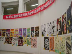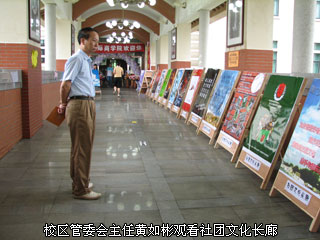 由一號樓通向二號樓的走廊,被布置成為社團(tuán)文化長廊,精心印制的統(tǒng)一大小的社團(tuán)海報排滿了長長的走廊,充分利用了空間展示了社團(tuán)文化,從另一個方面展示了大學(xué)生的風(fēng)采,達(dá)到了良好的宣傳效果。