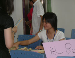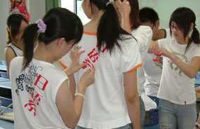 中文、日語等系的志愿者們在服裝的整齊劃一、別具特色上下了功夫。清爽的白色體恤牛仔褲盡顯大學(xué)生青春朝氣。中文系體恤上統(tǒng)一印有“中文系”字樣,同時還有學(xué)生們用顏料蓋上去的手印和簡單的涂鴉,即整齊又不死板,展現(xiàn)出團(tuán)結(jié)統(tǒng)一的集體精神,又充滿了朝氣,盡顯個性。日語系則是在白色體恤的后面粘貼上手工裁剪出的“日語系”字樣,辦法既簡單又不失新意。