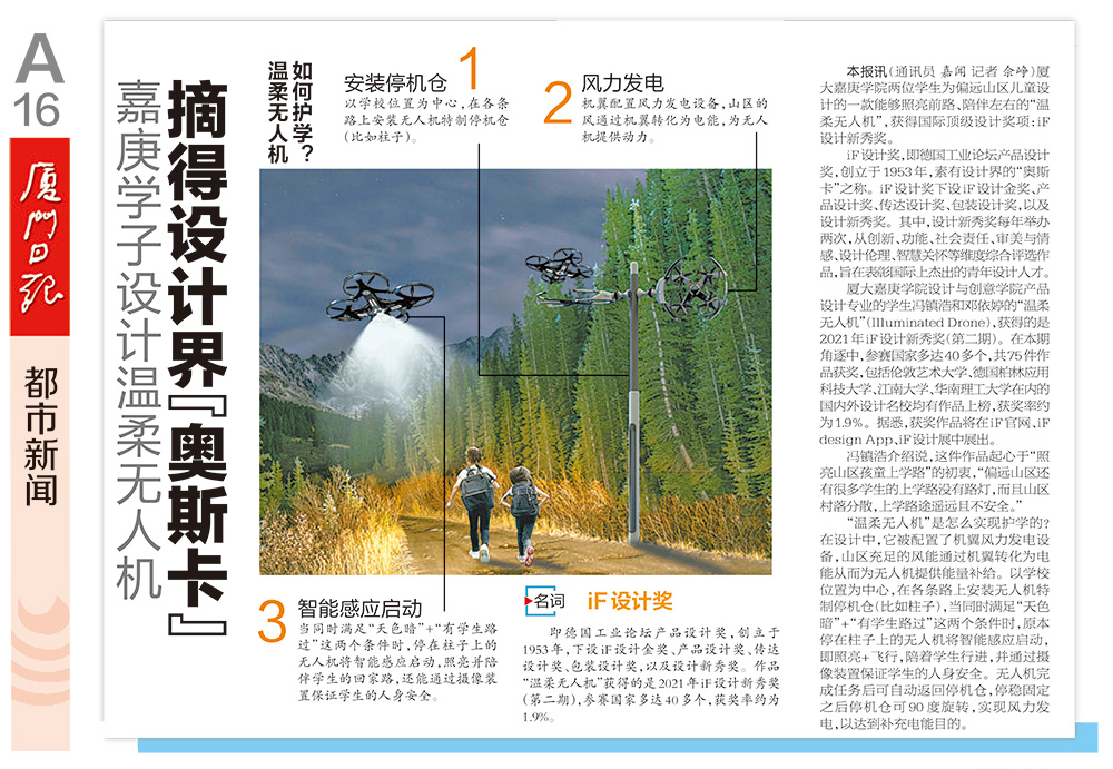 本報(bào)訊(通訊員 嘉聞 記者 佘崢)廈大嘉庚學(xué)院兩位學(xué)生為偏遠(yuǎn)山區(qū)兒童設(shè)計(jì)的一款能夠照亮前路、陪伴左右的“溫柔無(wú)人機(jī)”,獲得國(guó)際頂級(jí)設(shè)計(jì)獎(jiǎng)項(xiàng):iF設(shè)計(jì)新秀獎(jiǎng)。