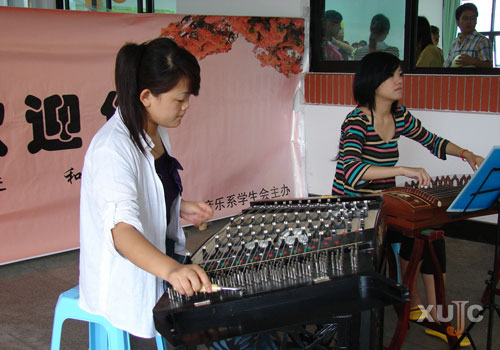 如果說(shuō)藝術(shù)設(shè)計(jì)系的展廳到處充滿(mǎn)著靈動(dòng)的創(chuàng)作才情,那么音樂(lè)系的展廳則時(shí)刻洋溢著跳躍的美麗音符。家長(zhǎng)還沒(méi)進(jìn)入音樂(lè)系展廳,就被悠揚(yáng)的中國(guó)民樂(lè)所吸引。悠揚(yáng)的古箏樂(lè)曲在音樂(lè)系學(xué)生的演奏下緩緩流淌于三樓的走廊。走近展廳又會(huì)被墻壁上所展示的“我們?cè)诔砷L(zhǎng)”系列所吸引。音樂(lè)系合唱團(tuán)、綜合音樂(lè)會(huì)、高校街舞挑戰(zhàn)賽……精彩紛呈的活動(dòng)展示描繪出音樂(lè)系不斷成長(zhǎng)的軌跡。