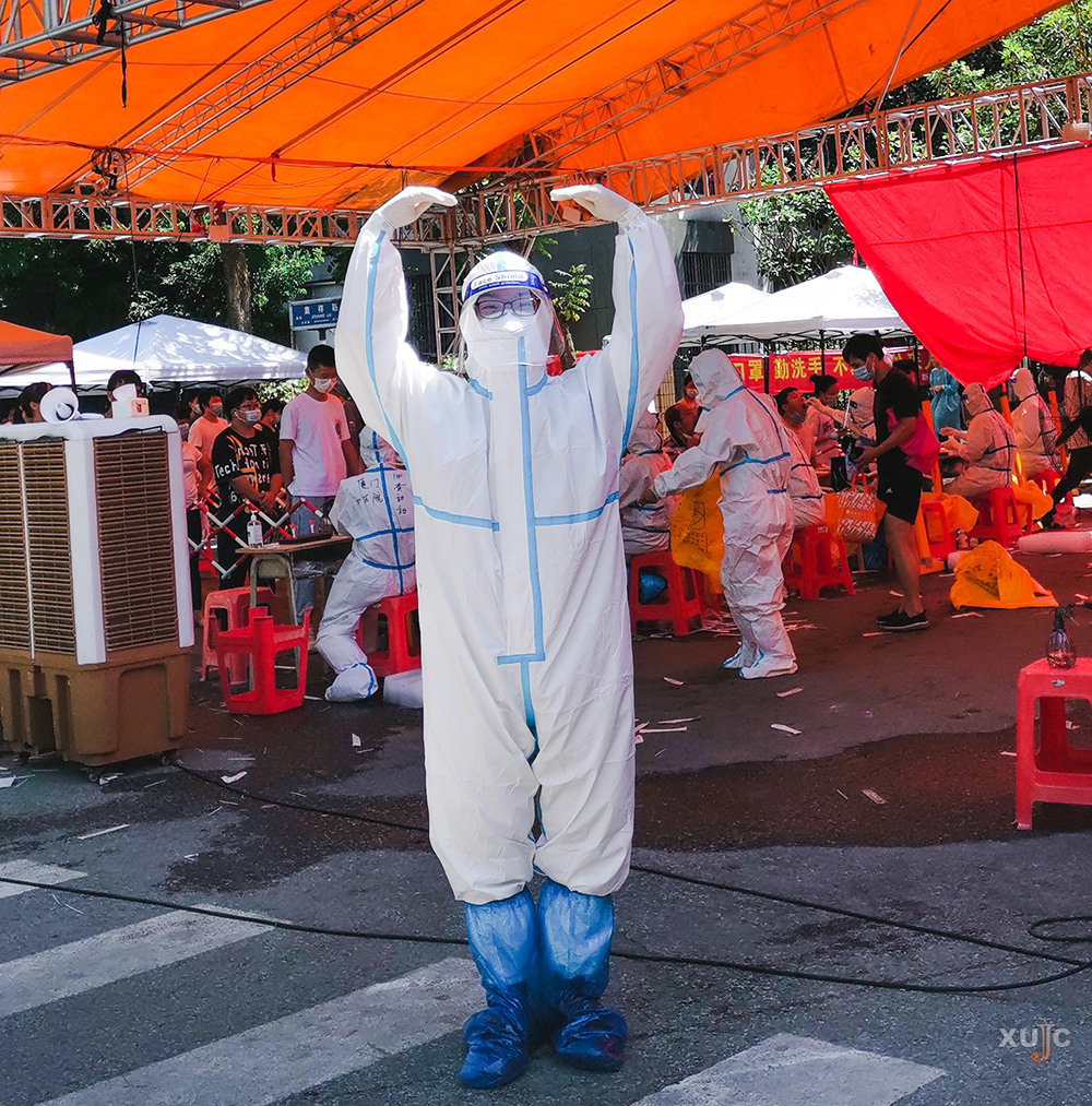 九月同安的天氣不是“秋高氣爽”,白天的最高溫度常常達(dá)到37度。而防護(hù)服內(nèi)的溫度可以達(dá)到50度,甚至是60多度。按照游仁杰的話來說“穿上防護(hù)服整個(gè)人就像處于一個(gè)大火爐里。”身著防護(hù)服、長(zhǎng)時(shí)間待在帳篷底下、長(zhǎng)期需要走動(dòng),就更加悶熱了,游仁杰透露,每當(dāng)他脫下防護(hù)服時(shí),汗水就“嘩啦”一下地從里面倒出來。雖然很辛苦,但志愿者們都勤懇地奮戰(zhàn)在自己的崗位上。