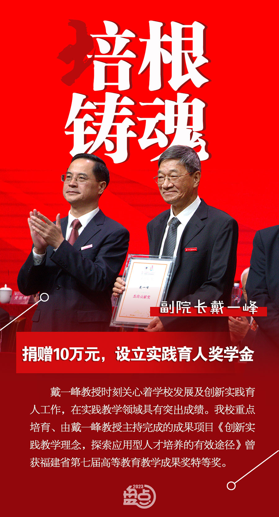 2023年十月,嘉庚學院喜迎二十周年校慶。為表彰在學校發(fā)展建設過程中作出杰出貢獻的教職工,學校設立廈門大學嘉庚學院杰出貢獻獎。2023年11月,首屆杰出貢獻獎獲獎者之一、副院長戴一峰教授將10萬元獎金捐贈給學校,設立實踐育人獎學金。此外,戴一峰教授還向圖書館捐贈了四千三百余冊珍貴的中外文藏書和文獻資料。所捐圖書資料涵蓋哲學與人文社會科學的諸多領域,另有《近代中國海關與中國財政》、《區(qū)域性經(jīng)濟發(fā)展與社會變遷》、《West Fujian: Land and Migration 1910s-1940s》等其個人論著,具有較高的學術價值。