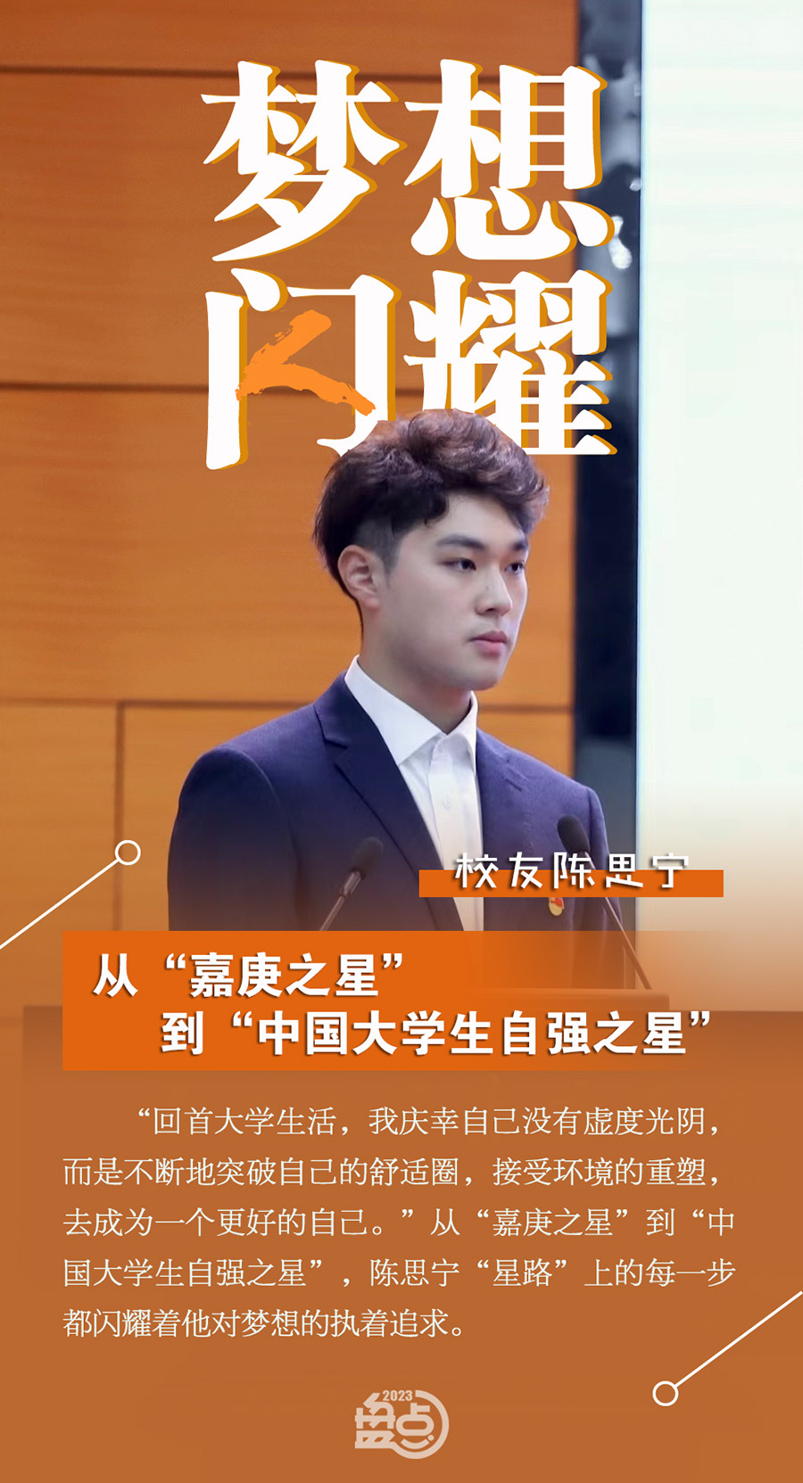 2023年10月,2022—2023年度“中國大學生自強之星”獎學金獲得者名單揭曉,國際商務學院2023屆畢業(yè)生陳思寧榜上有名,榮獲“中國大學生自強之星”獎學金。在校期間,他曾獲國家獎學金,獲評“嘉庚之星”、十佳志愿者等,積極參加“雙創(chuàng)”賽事,累計獲國家級獎項9項、省部級及以上獎項18項;收獲世界排名第八的倫敦大學學院等6所名校的offer,現(xiàn)于倫敦大學學院攻讀碩士研究生。