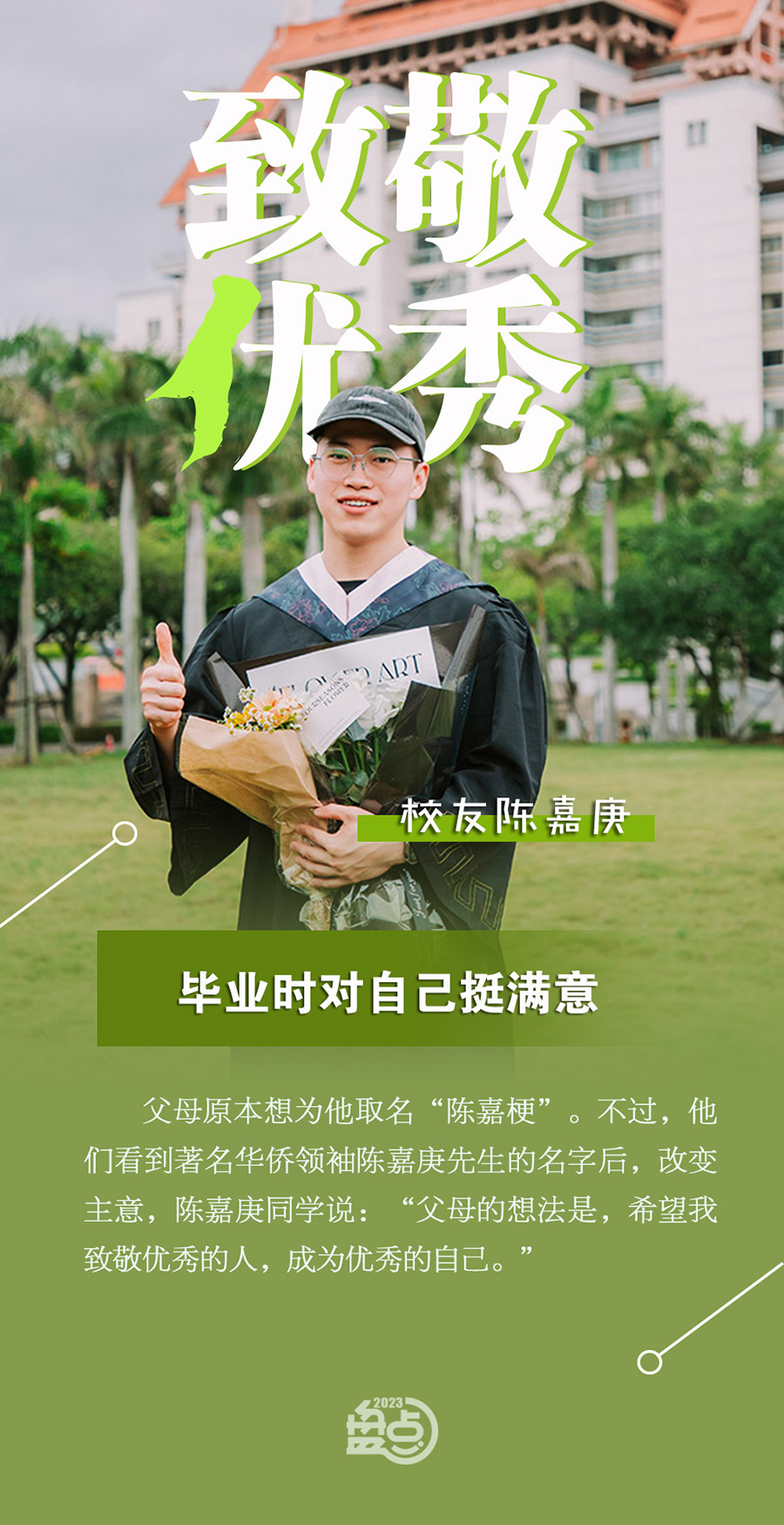 “00后”陳嘉庚同學和一所以著名華僑領袖陳嘉庚命名、也和他同名的大學朝夕相處了4年。進入嘉庚學院后,得益于學校體育俱樂部制及開放包容的運動氛圍,他重拾健身愛好,并潛心其中,踏實積累了4年,成為學校以及周邊健身圈小有名氣的“給力青年”。畢業(yè)時的他說:“我對自己挺滿意。”