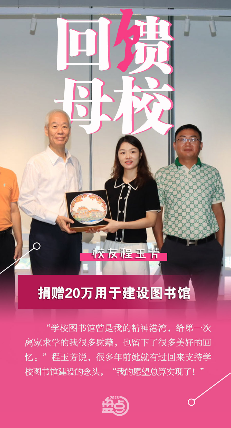 2023年10月21日一大早,程玉芳帶著兒子登上了從深圳開往廈門的動車。雖然當天到了學校也沒能趕上校慶大會,但她依然感覺非常好,她帶著孩子在校園里走走逛逛,還特地帶著兒子去了她最愛的圖書館。當天下午,她和校友會秘書處聯(lián)系,表達向?qū)W校捐贈20萬用于建設圖書館的意愿。2023年11月3日,這筆校慶捐款到賬。她說,這次捐贈,既是對母校的感恩,也想要把在“嘉園”感受到的諸多溫暖傳遞下去。
