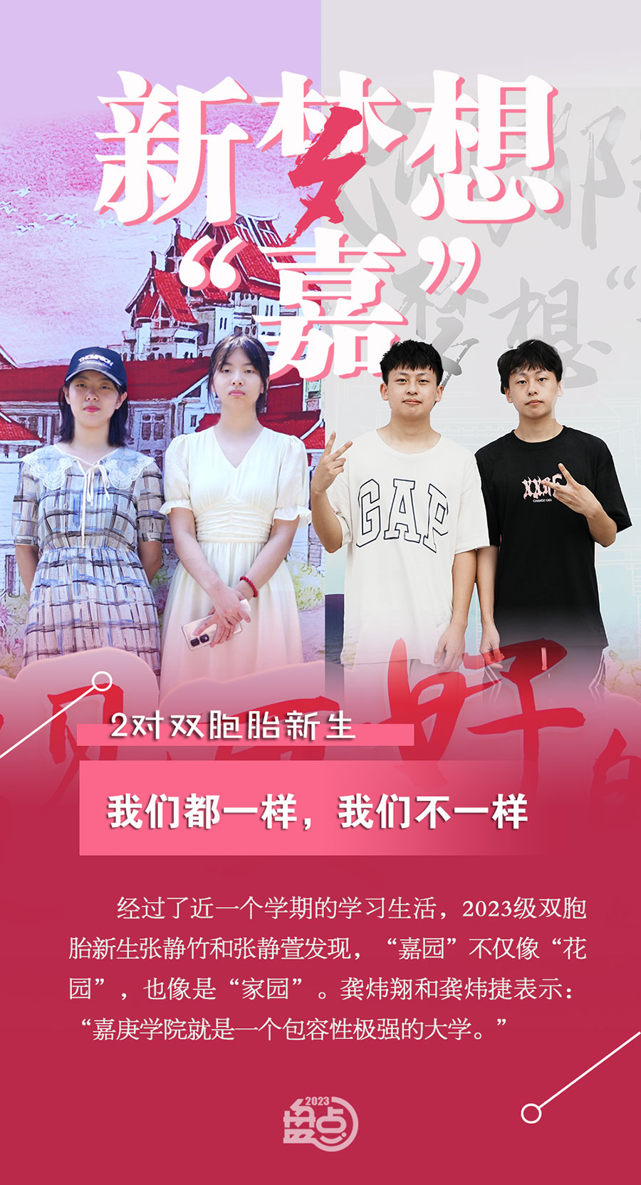 2023年,我校迎來了4000多名本科新生,其中有2對雙胞胎。土木工程學院雙生姐妹花——張靜竹和張靜萱,信息科學與技術學院新生雙胞胎龔煒翔和龔煒捷,他們積極融入大“嘉”庭,努力尋找屬于自己的精彩。
