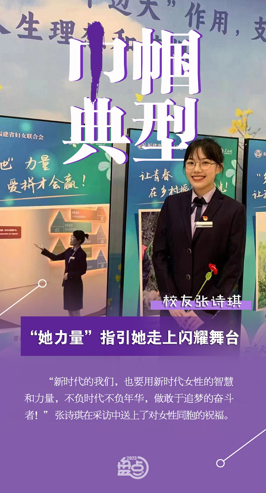 2023年3月7日上午,從春天向明天——黨的二十大精神主題宣講暨2023年“三八”國際婦女節(jié)紀念活動在福州市工人文化宮舉辦。本次活動由福建省婦女聯(lián)合會主辦,來自福建不同行業(yè)的23位女性代表作為巾幗典型在舞臺上分享了當代女性勇敢追夢,不忘初心的故事及精神。日本語言與文化學院2021屆校友張詩琪作為泉州晉江市委宣傳部“晉江經(jīng)驗”講解員代表登臺向大家講述了晉江人“愛拼敢贏”的晉江精神故事。