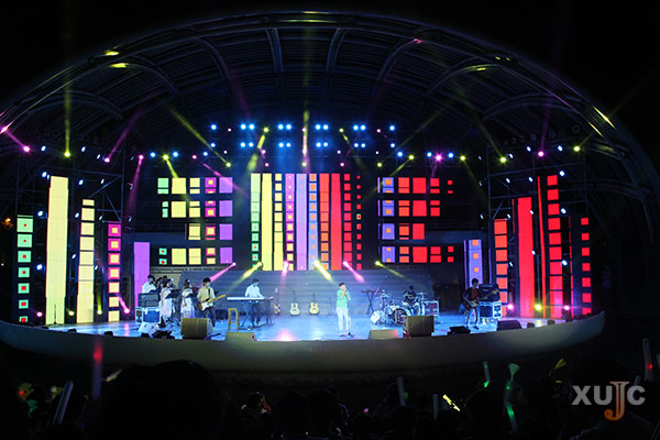 隨著“快女五強”劉惜君的出現(xiàn),歌會現(xiàn)場出現(xiàn)了一個高潮。劉惜君一出場就驚嘆地說:“現(xiàn)場有一兩萬人吧?舞臺很漂亮,我第一次在學校里見到這么漂亮的舞臺。”接著,她為大家?guī)砹恕赌菚r候的我》、《怎么唱情歌》等歌,全場人員跟著一起合唱。