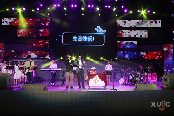 隨著越來越high的氣氛,舞臺下上萬名觀眾拿出手機,打開手機的照明燈,朝著舞臺揮舞。大家亮起的手機,遠遠望去就像一顆顆閃爍的星星。這時候,王瑞芳院長等人在眾人的歡呼聲中走上舞臺,和全場觀眾唱起了生日快樂歌,并舉行了切蛋糕儀式,祝嘉庚學院十周年生日快樂。王院長向所有同學許下承諾,“既然大家都這么開心。以后,嘉庚學院每年十月的第三個周末,都是校友歌會。”臺下的同學直呼“院長太給力了!”