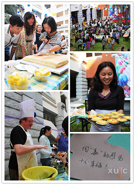英語系執(zhí)行主任楊昆、行政秘書兼輔導(dǎo)員陳毅超、陳毓榕熱情地接待到來的校友。英語系專任教師們各顯神通,郭瑞芬老師和范戈西老師在努力地制作月餅,月餅的制作吸引了不少同學(xué)觀看試做,孫佳妮老師不停地打著奶油,王淑娥老師和胡鳳蓮老師一邊做著蛋糕和一邊烘烤著蛋撻。