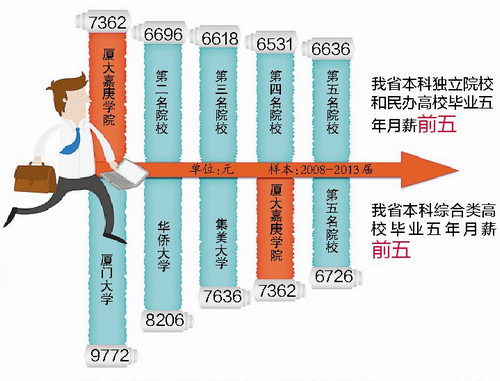 如果橫向從福建的本科獨(dú)立學(xué)院和民辦高???,2008-2013屆,廈大嘉庚學(xué)院以7362元的平均月薪均值位列第一名,超過(guò)全省高校平均月薪均值。如果縱向放到全省高校大盤(pán)子看,“福建省本科綜合類(lèi)高校畢業(yè)五年月薪”排名中,廈大嘉庚學(xué)院仍名列前茅,且僅以微弱差距次于第三名,排名第四位。
