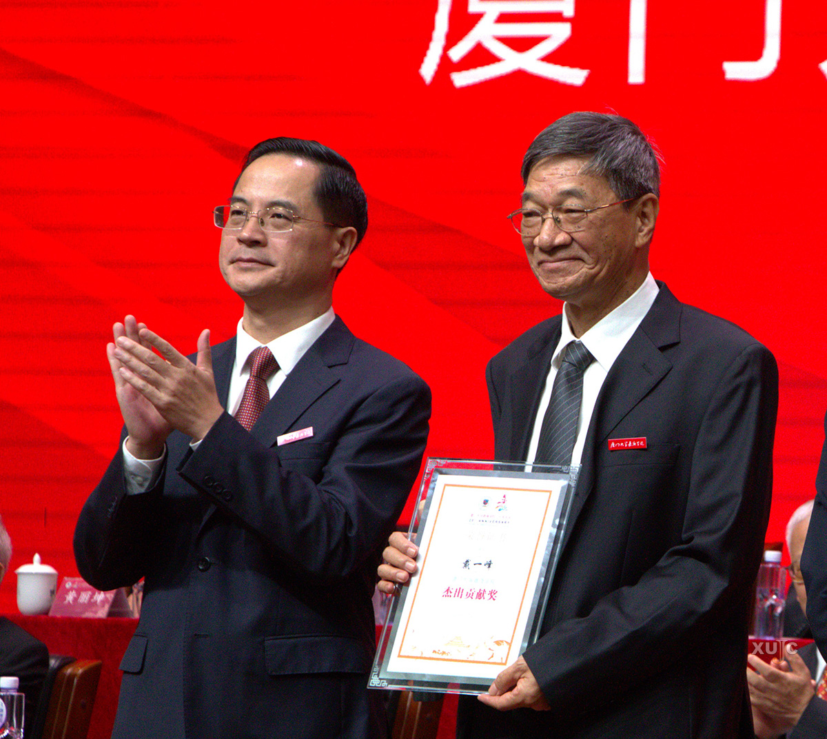 嘉庚學(xué)院黨委書記邱偉杰(左)為杰出貢獻(xiàn)獎獲得者戴一峰(右)頒獎