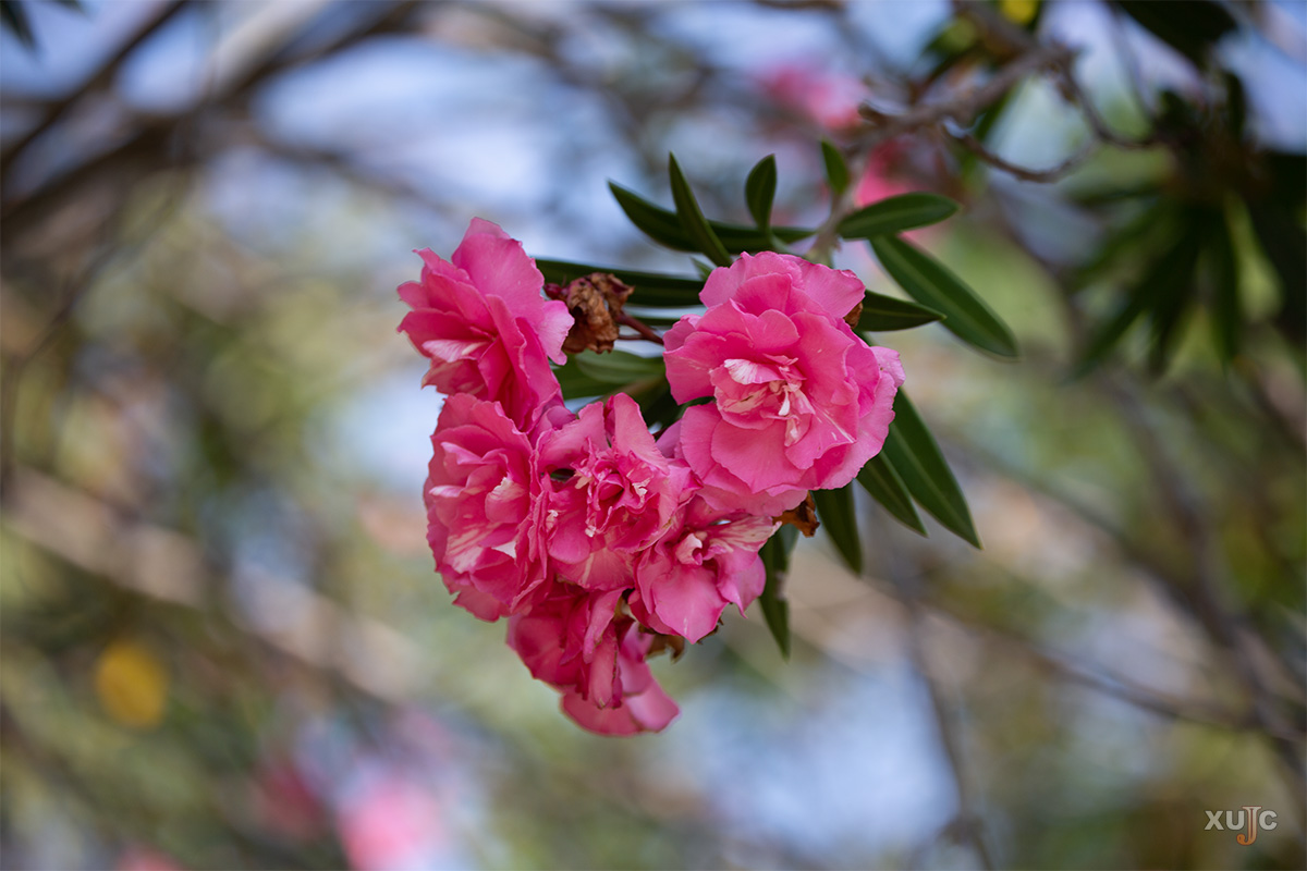 夾竹桃,原產于亞洲、歐洲及北美洲,可抗灰塵、抗毒物和凈化空氣、保護環(huán)境,在園林中常作為護欄旁的綠籬栽培。(朱鮮艷 攝)