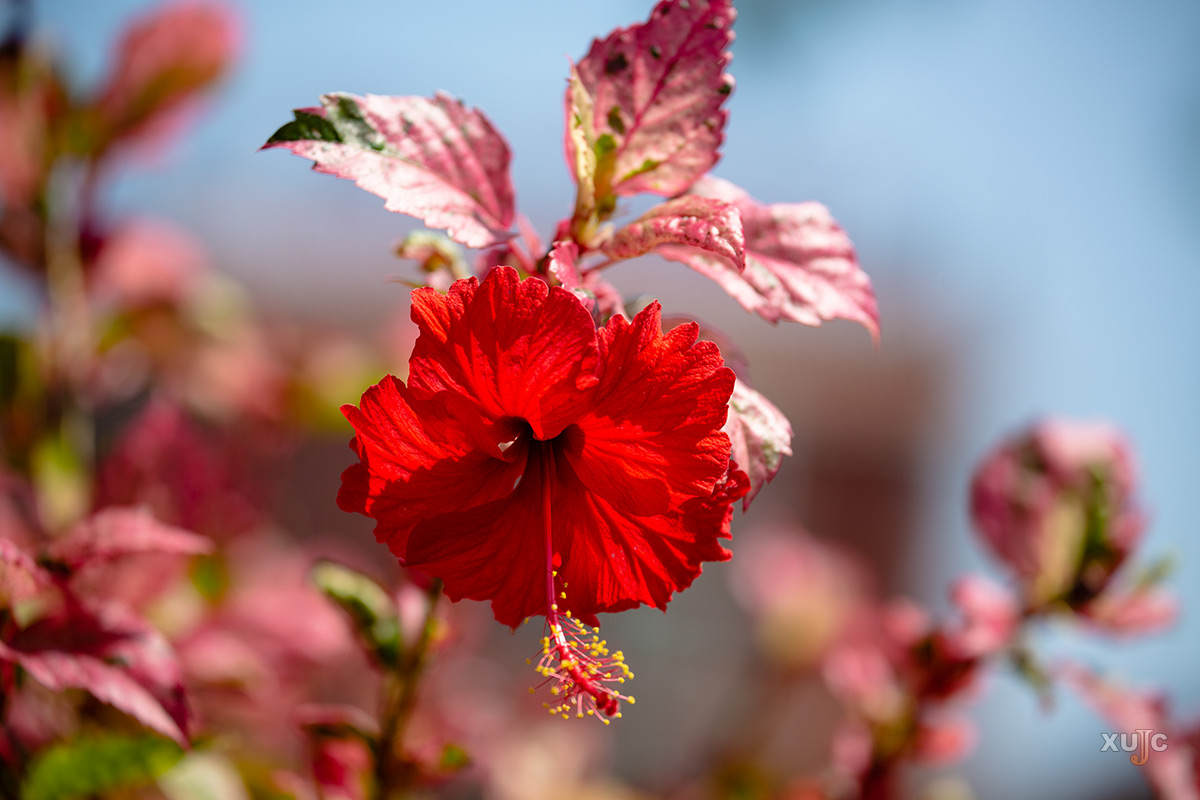 錦葉扶桑,原產于我國,又名彩葉扶桑,為扶桑的一個變種,花期幾乎是全年,花語為新鮮的愛、微妙的美等。(朱鮮艷 攝)